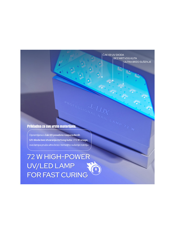 Zoznámte sa s J.-LUX – profesionálnou UV/LED lampou s až 69 diódami a výkonom 72 W, vytvorenou pre rýchlu a rovnomernú polymerizáciu všetkých typov gélov a permanentných lakov.