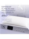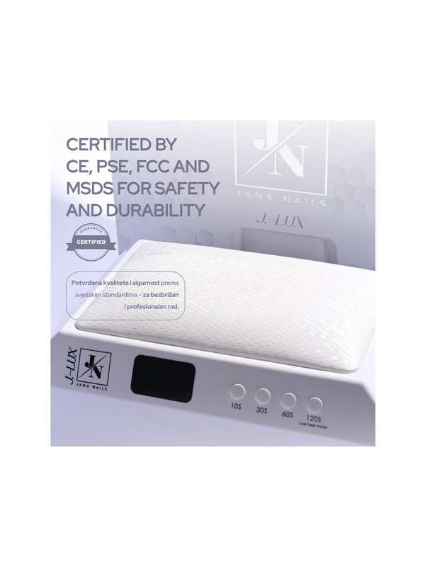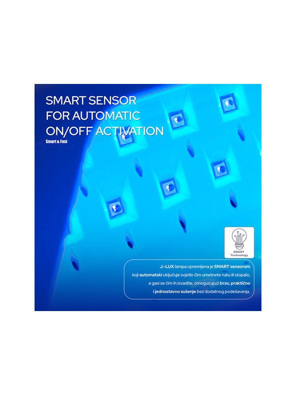 Dokonalá kombinácia dizajnu a technológie J.-LUX kombinuje výkon, ergonómiu a inteligentnú technológiu. Každá dióda je strategicky umiestnená, aby sa zabezpečilo úplne rovnomerné schnutie bez tzv. mŕtvych rohov, čo zaručuje perfektný výsledok v rekordnom čase. Elegantný biely dizajn s kovovými detailmi a pohodlnou lakťovou opierkou poskytuje stabilitu počas práce, zatiaľ čo odnímateľná základňa a umývateľná silikónová podložka umožňujú jednoduché čistenie a bezchybnú hygienu.